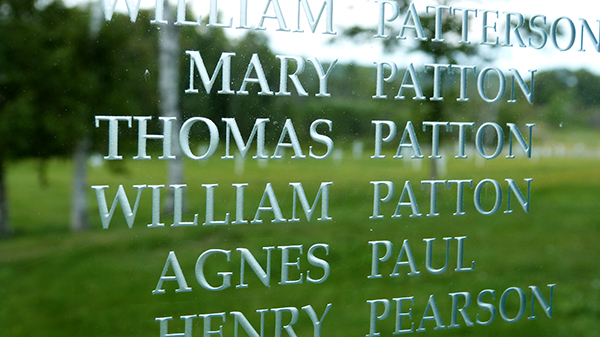 - Les noms des migrants sont affichés autour du mémorial de Grosse Île