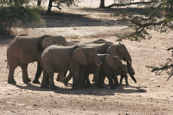 Il faut rouler doucement pour ne pas effrayer les animaux potentiellement présents, mais aussi pour guetter et avoir la chance de repérer nos amis à trompe. Nous ouvrons grands nos yeux tout en remontant le lit d’une rivière totalement asséchée. Notre pisteur nous indique de bien regarder sous les quelques arbres qui y poussent, car par 40°C, ces spécimens de la préhistoire recherchent l’ombre et la toute relative fraîcheur en restant immobiles sous les feuillages. Il est incroyable de croire que ces animaux ont pu s’adapter à des conditions climatiques si extrêmes.