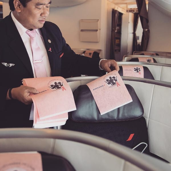 À l’intérieur de l’avion effectuant ce vol spécial, certains éléments étaient également relookés aux couleurs de notre association : têtière sur les fauteuils, serviettes pour les repas… À bord, nos goodies étaient proposés aux passagers et un ruban rose était offert à chacun d’entre eux.