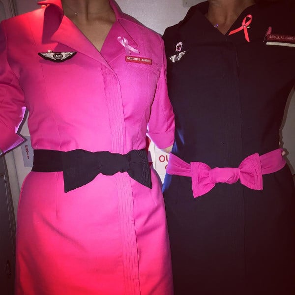 Pour donner de la visibilité à cet événement, tout le personnel au sol comme à bord portait du rose sur son uniforme (ceinture rose pour les hôtesses, au lieu du traditionnel rouge et cravate rose pour les stewards et pilotes). La direction d’Air France a même accepté que je sois vêtue d’un uniforme entièrement rose !