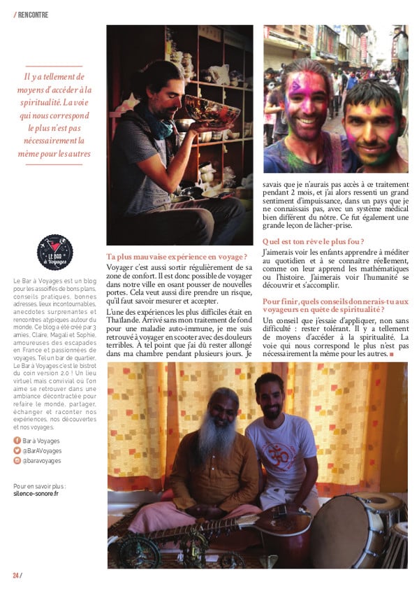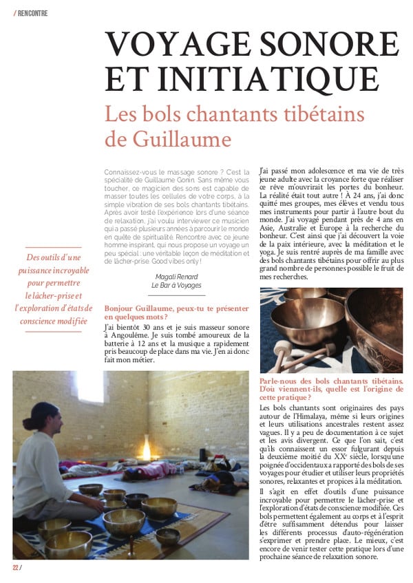 Cet article est dédié à sa rencontre pour comprendre comment fonctionnent ces massages sonores mais aussi pour découvrir les nombreux voyages autour du monde effectués par Guillaume. Des voyages qui ont façonné et transformé sa vie, mais qui lui ont aussi permis de se découvrir lui-même.