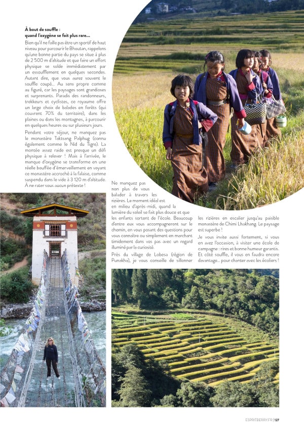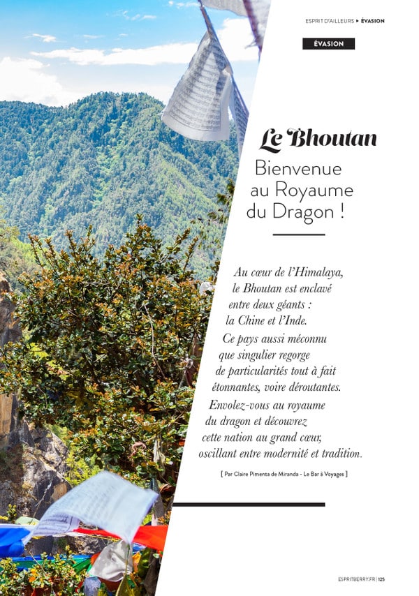 Partir au Bhoutan, c’est comme aller en Inde, on n’en revient jamais tout à fait pareil. C’est ce que l’on vous raconte dans le Magazine Esprit Berry n°7 de cette fin d’année. Nous consacrons 6 pages à ce petit royaume bouddhiste situé au pied de l’Himalaya qui n’aura de cesse de vous étonner.