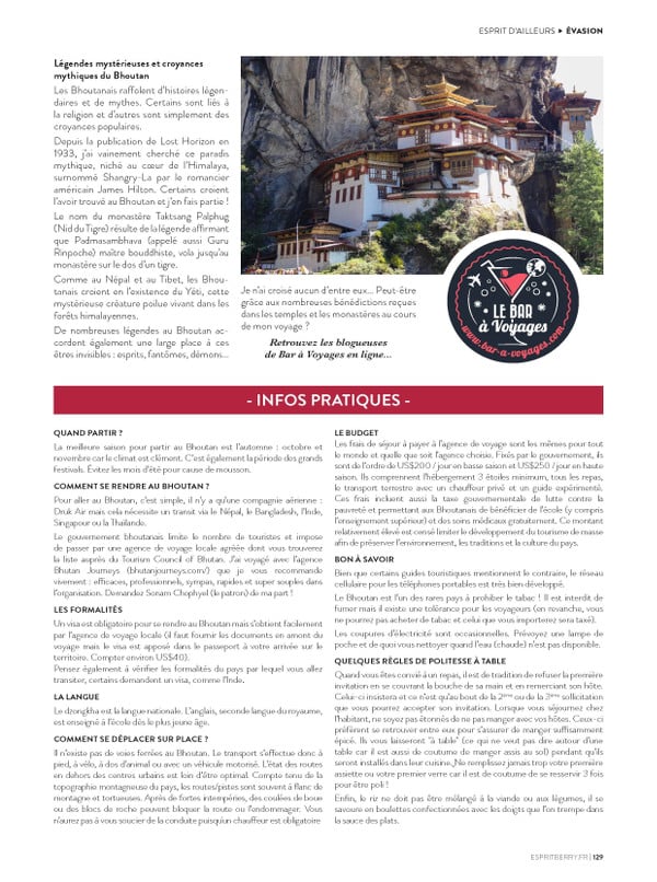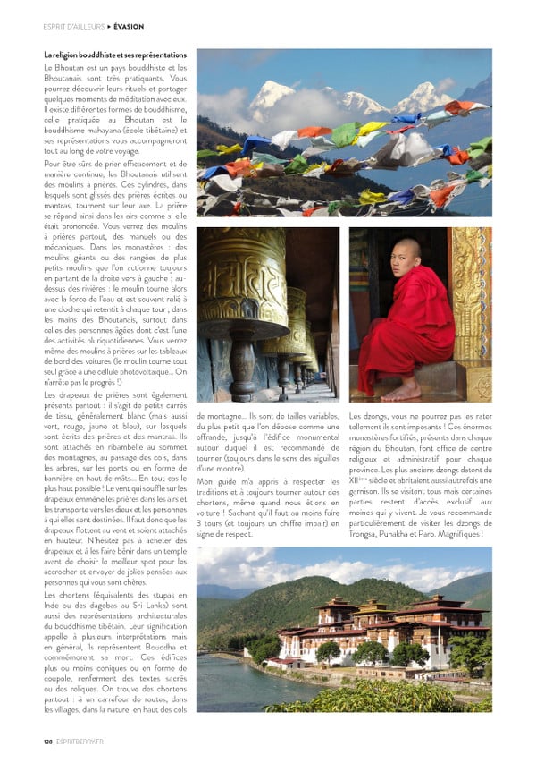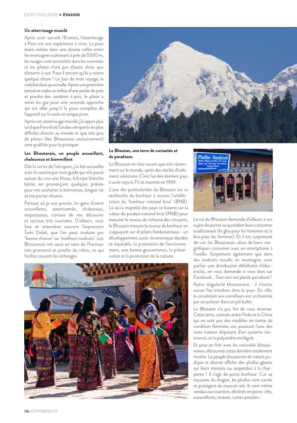 Parcourez les six pages consacrées au Bhoutan dans la rubrique «Esprit d’ailleurs» du magazine Esprit Berry n°7, pages 124 à 129. Téléchargez l’article sur le Bhoutan au format pdf ici.
