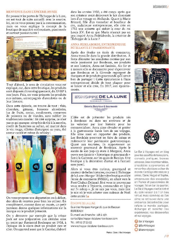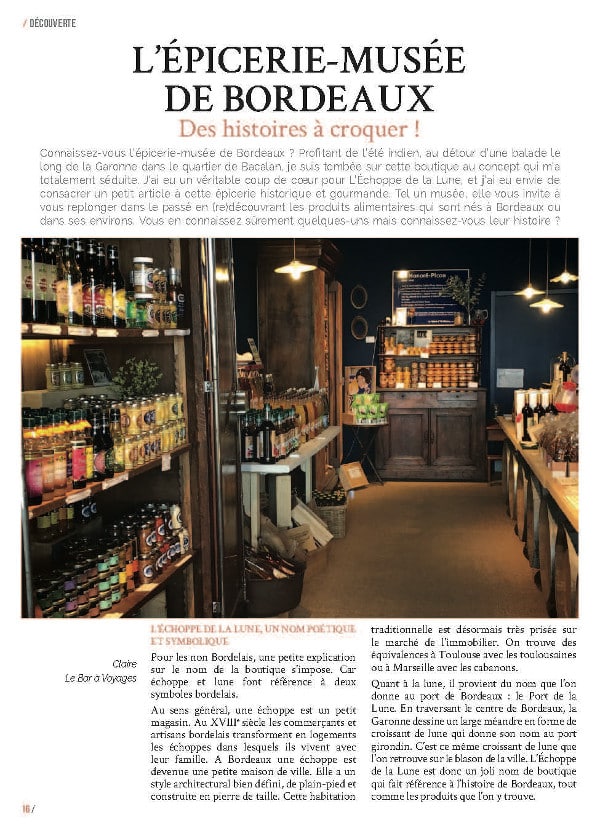 Si vous habitez à Bordeaux, ou si vous êtes de passage dans la capitale girondine, rendez-vous Quai des Marques, le long de la Garonne. Sur cette longue promenade, des dizaines de boutiques vous attendent pour votre shopping. Mais s’il y en a bien une qui se distingue des autres, c’est L’Echoppe de la Lune, une épicerie-musée. Elle se situe à proximité du pont Chaban Delmas et Claire vous dit tout dans son article dans le magazine MaVilleAMoi n°51 spécial fêtes !