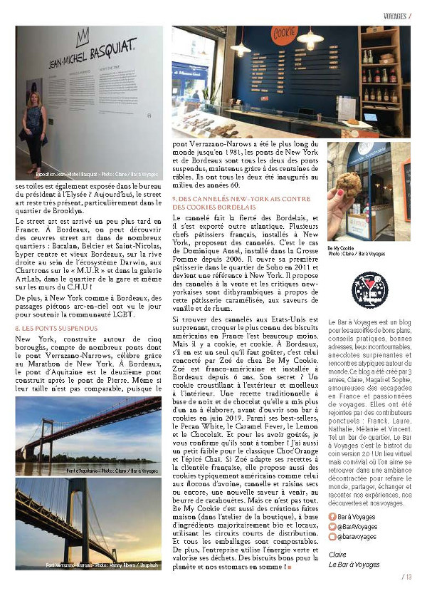 Après une courte pause, revoici le Bar à Voyages dans le magazine MaVilleAMoi n°56. Cette fois, on vous a concocté un petit comparatif entre deux villes : New York et Bordeaux. Car, aussi incroyable que cela puisse paraître, ces deux villes partagent de nombreux points communs. Et notre article fait même partie des gros titres, en couverture de ce numéro estival. Vous n’avez donc aucune chance de le louper. Alors, bonne lecture !