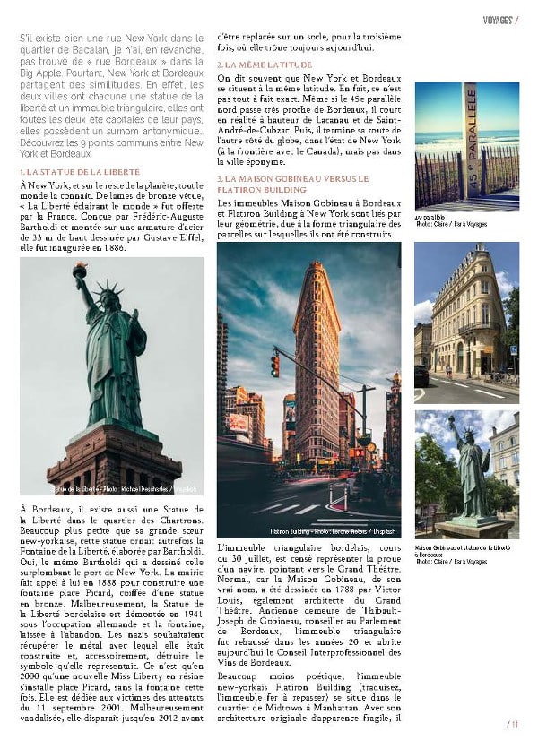 La Statue de la Liberté, le street art, un immeuble de forme triangulaire, un passé historique commun, mais aussi, un surnom antonymique, sont autant de similitudes que partagent Bordeaux et New York. Nous avons ainsi comptabilisé 9 points communs entre ces deux villes. Et nous les partageons avec vous dans notre article du magazine MaVilleAMoi n°56.