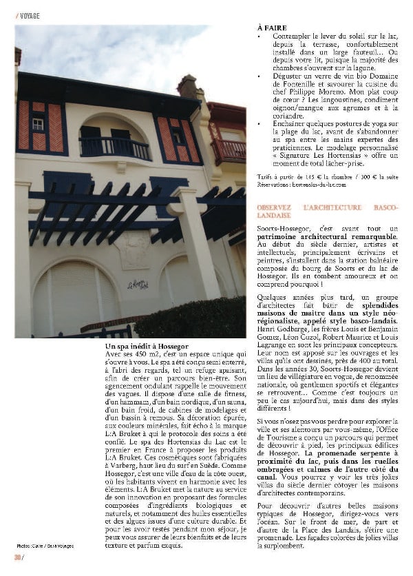 Dans le magazine MaVilleAMoi n°57, nous traitons d’une destination déjà présentée il y a quelques années, mais avec des informations nouvelles, et surtout, complémentaires. En effet, Claire a eu la chance de séjourner dans le magnifique hôtel Les Hortensias du Lac, une institution à Hossegor, notre petite Californie française.