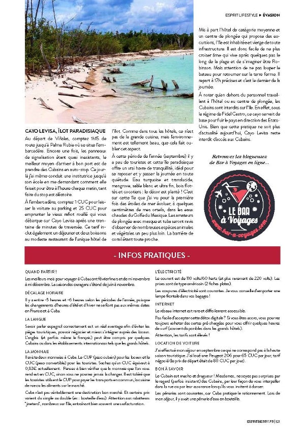 Parcourez les cinq pages consacrées à Cuba dans la rubrique «Esprit d’ailleurs» du magazine Esprit Berry n°10, pages 117 à 121. Téléchargez l’article sur Cuba au format pdf ici.