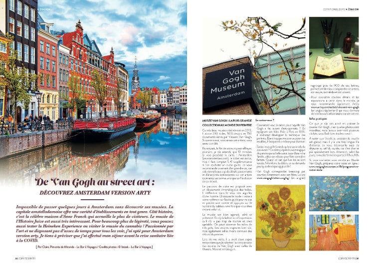 Après une petite pause, revoici le Bar à Voyages dans le magazine Esprit Berry n°11. Dans ce nouveau numéro, on vous emmène à la découverte de la capitale hollandaise, mais sous un angle artistique. D’ailleurs, saviez-vous qu’Amsterdam compte plus d’une cinquantaine de musées ? Nous avons visité les principaux et vous livrons nos impressions, sans oublier tous nos conseils malins.